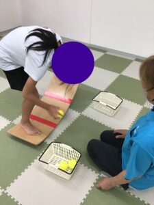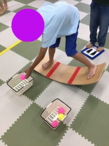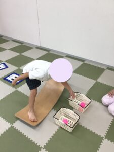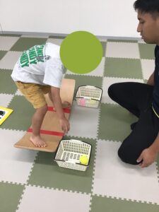先日はバランスボードに乗った状態でカゴに入っているボールを移し替えることにチャレンジしました!!