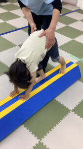 平均台で「くま歩き」「後ろくま歩き」や「ゆりかご」をしました!